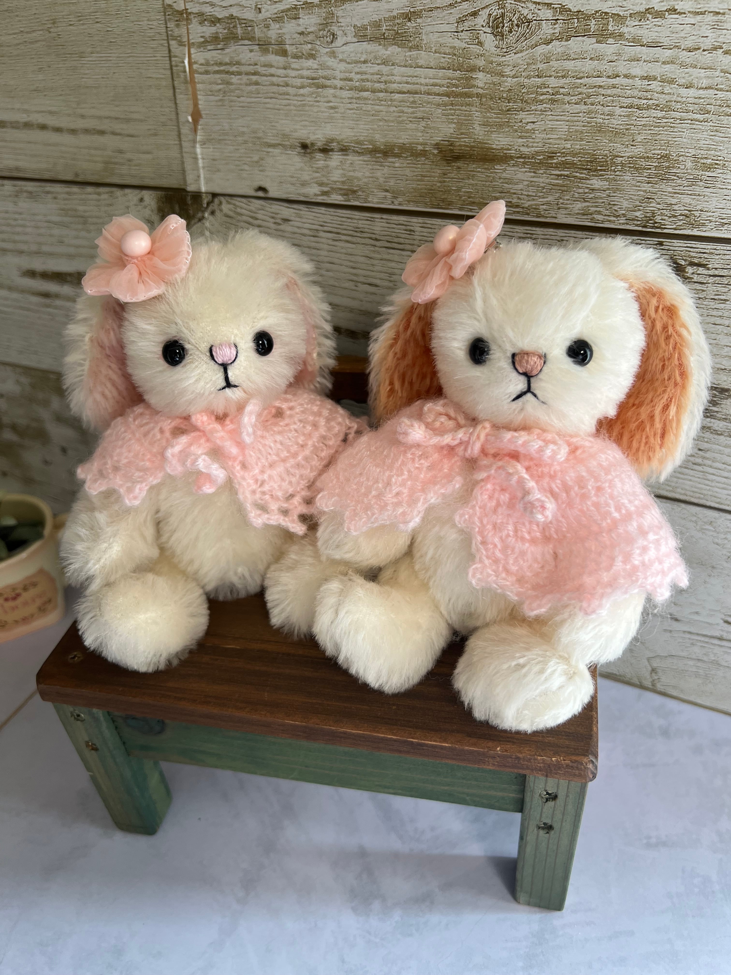 まっしろロップイヤー カレンちゃん 真っ白なふわふわの毛並みに、 やさしいサーモンピンクの耳がかわいらしい、ロップイヤーのぬいぐるみです。 テディベアと同じ技法で、ひと針ひと針 丁寧に手縫いしています。 天然素材のモヘアを使っているので、ふんわりとした手触りと、 思わず見つめたくなるような愛らしい表情が魅力です。 お気に入りのピンク色の手編みのケープを身につけています。 ふわりと柔らかな印象ながら、 中にはしっかりと綿が詰まっていて、手作りの安心感があります。 5ジョイント仕様なので、頭や手足を動かせます。 おすわりポーズにしたり、手を上げてみたりと、 お好きなポーズでお楽しみください。 ⸻ 身長:約18cm 体重:約130g 素材 モヘア/グラスアイ/5ジョイント(ハードボードジョイント) ポリエステル綿/グラスビーズ/ステンレスボール 刺しゅう糸/手編みケープ ⸻ 手のひらにのせると、ほっと心が和むような小さなうさぎさん。 ご自分へのごほうびにも、大切な方への贈りものにもぴったりです。 ※グラスアイを使用していますので、小さなお子様には不向きです。